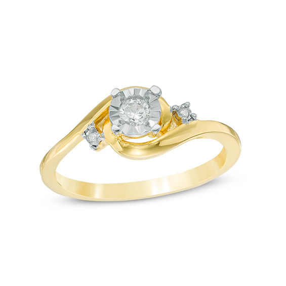 Sleek and oh-so-chic, this shimmering diamond promise ring makes a statement. Crafted in warm 10K gold, this three-stone design features a centre diamond, artfully set to enhance size and sparkle, flanked by two smaller diamonds and a swirling bypass-style shank. Radiant with 0.09 ct. t.w. of diamonds and a brilliant buffed lustre, this promise ring will win her heart.
