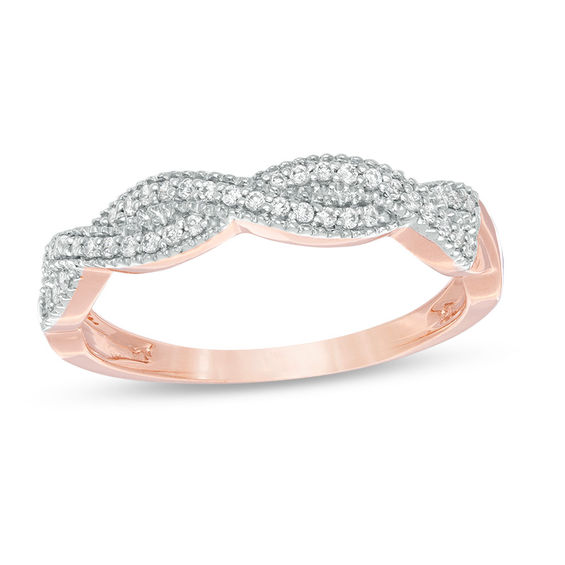 Appeal to her love of vintage-inspired design with this beautiful diamond ring. Fashioned in precious 10K rose gold, this glamorous look features ribbons lined with sparkling diamonds and intricate milgrain detailing in a graceful twist. Radiant with 0.147 ct. t.w. of diamonds and a brilliant buffed lustre, this ring is a keepsake accessory she’ll want to wear often.