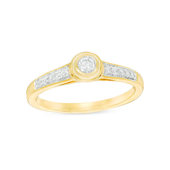 Surprise and delight her with this sparkling diamond promise ring. Crafted in warm 10K gold, this dazzling design features a beautiful bezel-set 0.09 ct. diamond at its centre. Additional diamonds line the ringâs shank. Captivating with 0.18 ct. t.w. of diamonds and a brilliant buffed lustre, this promise ring seals your commitment.