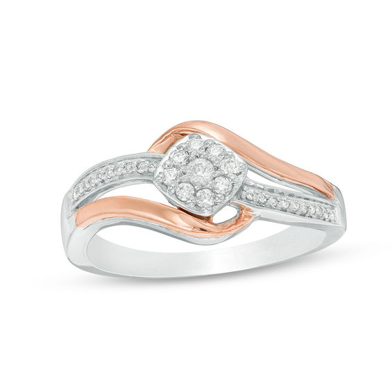Everything she dreamed of, this sparkling diamond promise ring shares your love. Crafted in sterling silver and 10K rose gold, this shimmering design features a tilted cushion-shaped diamond composite in silver atop a curved diamond-lined silver band. A rose gold ribbon bypasses the centrepiece to create a split shank. Radiant with 0.18 ct. t.w. of diamonds and a brilliant buffed lustre, this promise ring celebrates your unity. Custom-made to fit her ring size. Sterling silver rings cannot be resized after purchase.