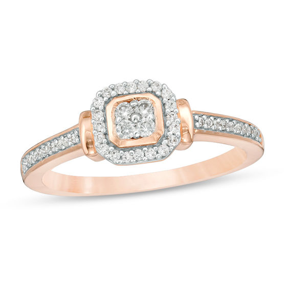 Seal your pledge with this shimmering diamond promise ring. Crafted in precious 10K rose gold, this unique style dazzles with a quartet of sparkling diamonds wrapped in an octagon-shaped polished rim and an octagonal frame of petite diamonds. Polished collars and a diamond-lined shank complete this bold design. Radiant with 0.18 ct. t.w. of diamond and a brilliant buffed lustre, this promise ring marks your bright future.