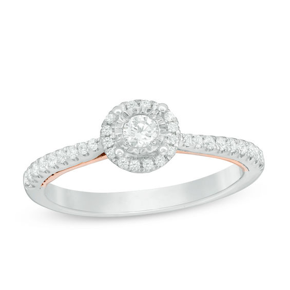 Sleek and streamlined, this dramatic diamond engagement ring is designed to delight. Crafted in 10K white gold, this shimmering style features a 0.09 ct. diamond – artfully set to enhance size and sparkle – wrapped in a frame of diamonds. The slender tapered shank is lined with diamonds – while underneath, a 10K rose gold detail lends a chic touch. Radiant with 0.33 ct. t.w. of diamonds and a bright polished shine, this engagement ring celebrates your commitment.