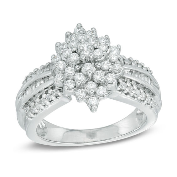 A glamorous look, this diamond fashion ring is sure to become a jewellery box favourite. Crafted in sterling silver, this dramatic design features shimmering round diamonds arranged in a grand marquise shaped clustre at the centre. Round and baguette-cut, channel-set diamonds line the graceful shank. A smart look for the left or right hand, this ring delights with 0.45 ct. t.w. of diamonds and a bright polished shine. Custom-made to fit her ring size. Sterling silver rings cannot be resized after purchase.