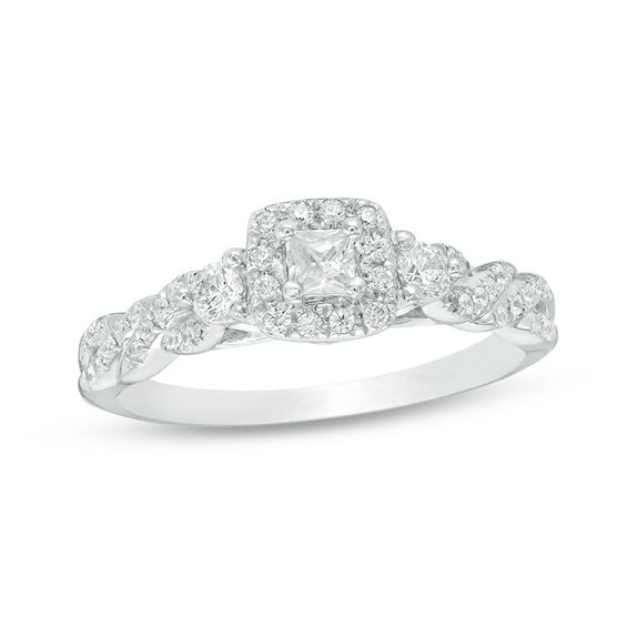 Ask for her hand with this dazzling vintage-inspired diamond Past Present Future® engagement ring. Crafted in cool 10K white gold, this shimmering design features a 0.145 ct. princess-cut diamond centre stone -wrapped in a cushion-shaped frame of round diamonds – flanked by two 0.085 ct. round diamonds. The diamond-lined and milgrain twist shank adds sparkle to the look. Engraved inside the band and set with two accent diamonds, the words “Past; Present, Future” remind her of your promise to always be by her side. Radiant with 0.45 ct. t.w. of diamonds and a bright polished shine, this engagement ring sets the stage for romance. This style is available in size 7 only.