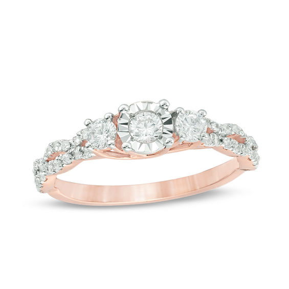 Honour her with this spectacular diamond engagement ring. Crafted in precious 10K rose gold, this statement maker features a 0.18 ct. diamond – artfully set to enhance size and sparkle – flanked by 0.09 ct. diamonds. Shimmering diamonds create the scallop-edged open shank. Radiant with 0.58 ct. t.w. of diamonds and a brilliant buffed lustre, this three-stone engagement ring is a memory in the making.