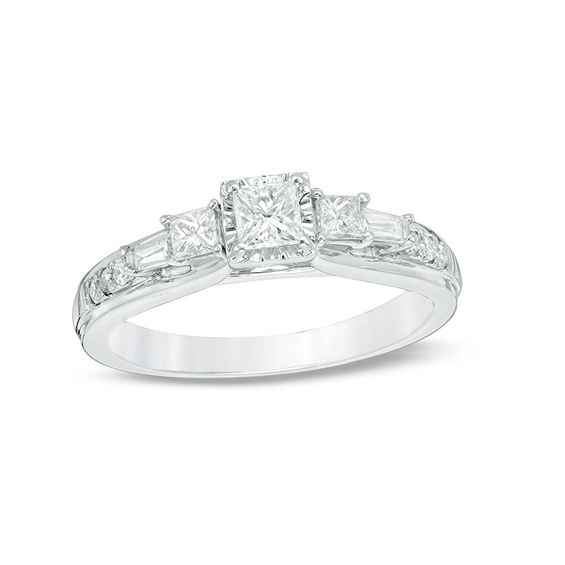 Match her modern style with this exciting Past Present Future® diamond engagement ring. Crafted in 14K white gold, this chic design features a shimmering 0.23 ct. princess-cut diamond centre stone – artfully set to enhance size and sparkle – flanked by 0.09 ct. princess-cut diamonds. Baguette-cut and round diamonds line the stepped shank. The inside of the shank is engraved with the words “Past Present Future” and set with two burnished accent diamonds, a beautiful reminder of your promise to always be by her side. Captivating with 0.59 ct. t.w. of diamonds and a bright polished shine, this comfort-fit engagement ring is a contemporary look she’ll adore.