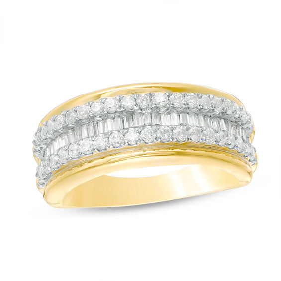 Beautifully designed for maximum sparkle, this bright diamond anniversary band will dazzle and delight her. Crafted in warm 10K gold, this bold band features a row of baguette-cut diamonds framed by rows of round diamonds. Radiant with 0.70 ct. t.w. of diamonds and a brilliant buffed lustre, this sculpted stepped-edge anniversary band is a splendid reminder of your love.