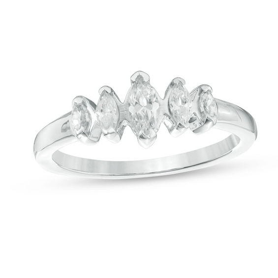 Capture her heart with the enchanting look of this diamond wedding band. Crafted in cool 10K white gold, this five-stone design features shimmering marquise-cut diamonds – the largest the 0.24 ct. centre stone – set vertically along the shank. Classic and streamlined, this engagement ring captivates with 0.70 ct. t.w. of diamonds and a bright polished shine.