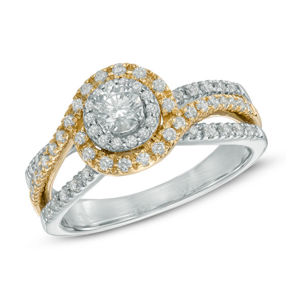 Surprise the woman you love with this captivating diamond engagement ring. Fashioned of 14K two-toned gold, this contemporary design showcases a 0.25 ct. certified Canadian diamond centre stone with a colour ranking of I and clarity of I1. A double border of shimmering round accent diamonds surrounds the centre stone while additional diamonds line the flowing triple shank. Perfect for the sophisticated bride, this on-trend engagement ring captivates with 0.75 ct. t.w. of diamonds and a bright polished shine. This style also comes with a certificate that includes a photo and description of the diamond, which guarantees quality and can be used for insurance purposes.