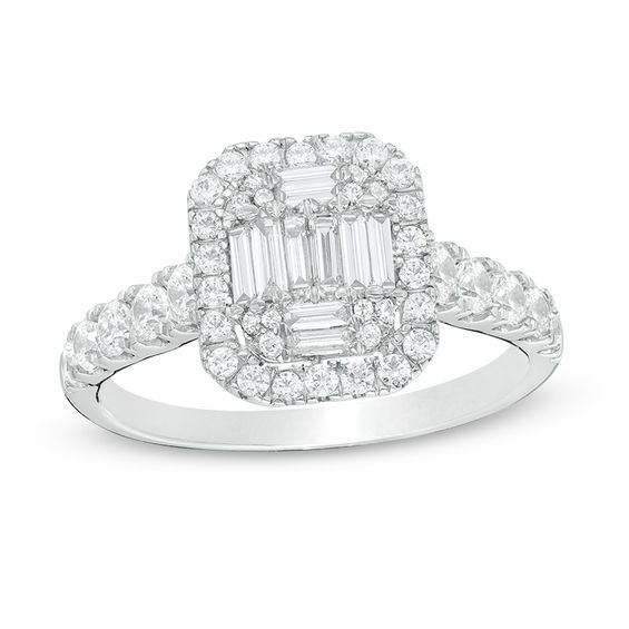 Begin your lifetime of love with this gorgeous diamond engagement ring. Crafted in 14K white gold, this sophisticated choice showcases a cushion-shaped composite of baguette-cut and round diamonds – all wrapped in a diamond-lined frame. Each side of the shank sparkles with a row of four 0.05 ct. diamonds punctuated by a smaller diamond. Radiant with 0.85 ct. t.w. of diamonds and a bright polished shine, this engagement ring suits her glamorous style.