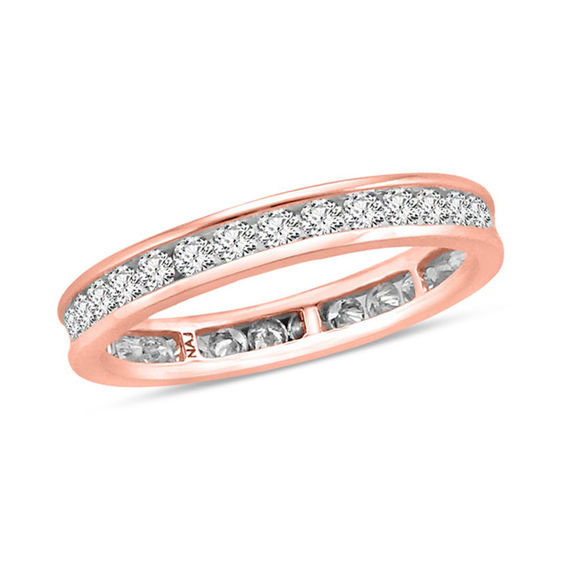 She means the world to you. Celebrate your wedding day, or let her know you’d marry her all over again with this exquisite diamond eternity band. Fashioned in precious 14K rose gold, this ring shimmers with 0.95 ct. t.w. of dazzling round-cut diamonds hand channel-set into the shank. Completely surrounded in diamonds and buffed to a polished lustre, this band is brilliant symbol of your everlasting love.