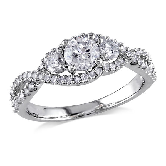 Your love shines with this sensational diamond engagement ring. Crafted in cool 14K white gold, this sparkling design showcases a 0.50 ct. diamond flanked by smaller diamonds. Two diamond-lined ribbons create a border around the three-stone style, and then twist to create the ring’s split shank. Captivating with 0.99 ct. t.w. of diamonds and a brilliant buffed lustre, this twist engagement ring will surprise and delight.
