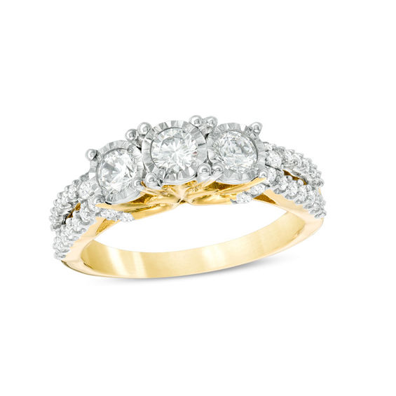 Proclaim your affection with this stunning Past Present Future® diamond engagement ring. Crafted in warm 10K gold, this dazzling design features three shimmering 0.19 ct. diamonds – artfully set to enhance size and sparkle – nestled side by side atop a shimmering curved split shank. Inside, the shank is engraved with “Past; Present, Future” and set with two accent diamonds, a beautiful reminder of your promise to always be by her side. Radiant with 1.00 ct. t.w. of diamonds and a bright polished shine, this engagement ring is a symbol of your forever love.
