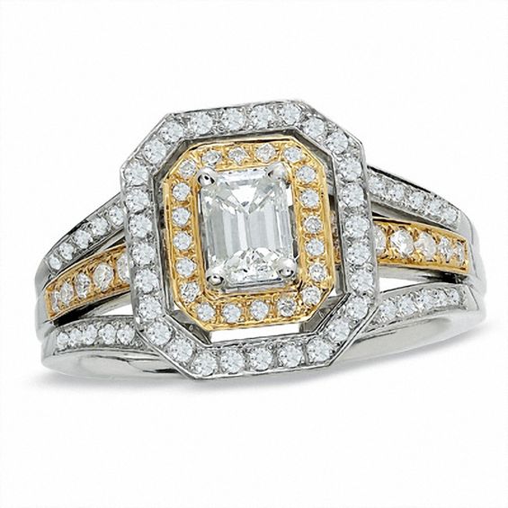 A complement to her beautiful smile, diamonds totalling 1.00 ct. brighten this stunning engagement ring. Set in the contrasting elegance of 14K two-tone gold, two diamond-studded frames outline a breathtaking 0.50 ct. emerald-cut diamond eminent at the centre. Completely lined in diamond accents, the white gold split shank is interrupted by a yellow gold ribbon sparkling through the centre. Express your love for her with this luminescent masterpiece.