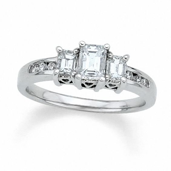 A brilliant, beautiful, magnificent ring with the perfect balance and harmony of the classic three stone design in 14K white gold. At the ring’s heart, a centremost emerald-cut diamond shows its majestic cut to the fullest. Two side stones continue the emerald cut theme. Contrasting with the right angles and smooth lines of the emerald cut, round diamonds sparkle within a channel setting on either side, bringing the total weight to a lovely 1.00 ct.