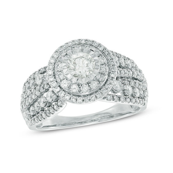 Honour the woman you adore with this bold and beautiful diamond engagement ring. Fashioned in 14K white gold, the eye is drawn to the 0.29 ct. round diamond at the centre of the style. A double halo frame of smaller accent diamonds surrounds the centre stone, while row after row of diamonds line’s the ring’s wide shank. A meaningful look of love, this ring delights with 1.10 cts. t.w. of diamonds and a polished shine.