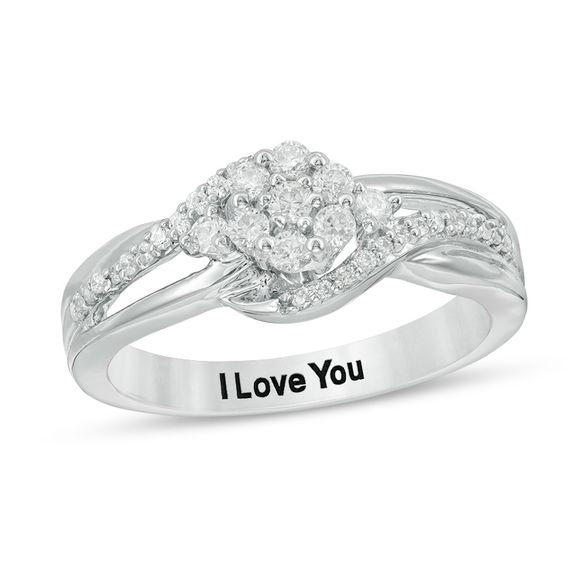 As your love grows, show her how much she means to you with this beautiful Personalized diamond promise ring. Created in sterling silver, this chic design showcases a composite of sparkling diamonds gracefully embraced by the bypassing diamond-lined centre ribbons of the triple-row split shank. Make the look hers with a name or message – up to 15 characters in length – inscribed in a print font along the inside of the shank. Shimmering with 1/3 ct. t.w. of diamonds and a bright polished shine, this promise ring is certain to please. Custom-made to fit her ring size. Sterling silver rings cannot be resized after purchase.
