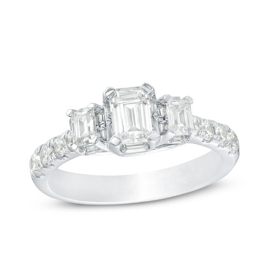 Ask for her hand with this sparkling certified diamond engagement ring from Past Present Future®. Crafted in 14K white gold, this dreamy design showcases a 0.47 ct. certified emerald-cut diamond flanked by 0.19 ct. certified emerald-cut diamonds – each boasting a colour rank of I and clarity of SI2. Chic baguette-cut diamonds create a stepped frame around each stone, while round diamonds shimmer along the shank. The inside of the shank is engraved with the words “Past Present Future” and set with two accent diamonds, a beautiful reminder of your promise to always be by her side. Magnificent with 1.50 cts. t.w. of diamonds and a brilliant buffed lustre, this three-stone engagement ring is an inspired choice. This style arrives with a certificate that includes a photo and description of the diamond, which guarantees quality and can be used for insurance purposes.