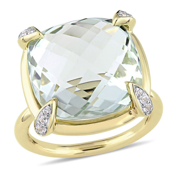 15.0mm Faceted Cushion-Cut Green Quartz and White Sapphire Ring in 14K
