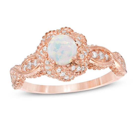 A glamorous choice, this vintage-inspired ring is a gorgeous accessory sheâll enjoy wearing. Crafted in sterling silver with 14K rose gold plate, this romantic design showcases a 4.8mm lab-created iridescent opal cabochon wrapped in a sculpted frame adorned with sparkling petite diamonds and intricate milgrain detailing. The shank shimmers with graduated-size diamonds artfully wrapped in milgrain-lined twist ribbons. Captivating with 0.18 ct. t.w. of diamonds and a brilliant buffed lustre, this style exudes elegance. Custom-made to fit her ring size. Sterling silver rings cannot be resized after purchase.