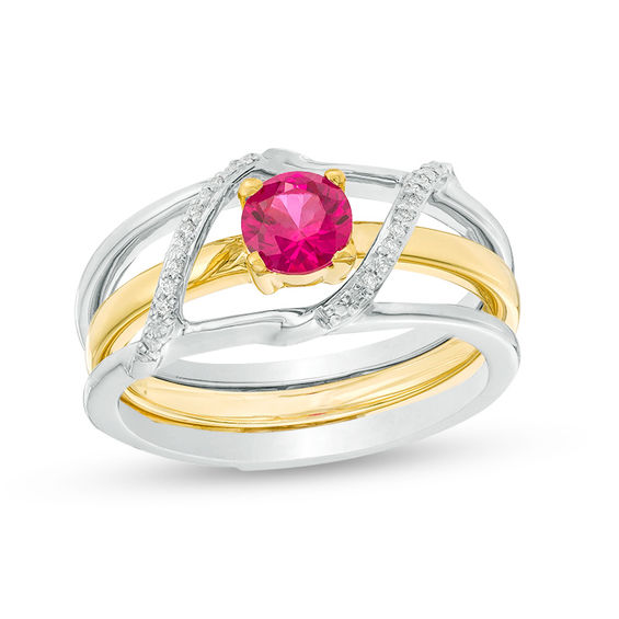 Unexpected and unforgettable, this three-in-one ring is sure to turn heads. Crafted in warm 10K gold, the vibrant inner ring showcases a 5.0mm lab-created bright red ruby solitaire. The sterling silver outer ring features two sparkling diamond-lined curved ribbons that connect two polished bands. Wear these pieces separately or bring them together for a unique look. Captivating with 0.04 ct. t.w. of diamonds and a brilliant buffed lustre, this ring offers a variety of style options. Custom-made to fit her ring size. Sterling silver rings cannot be resized after purchase.