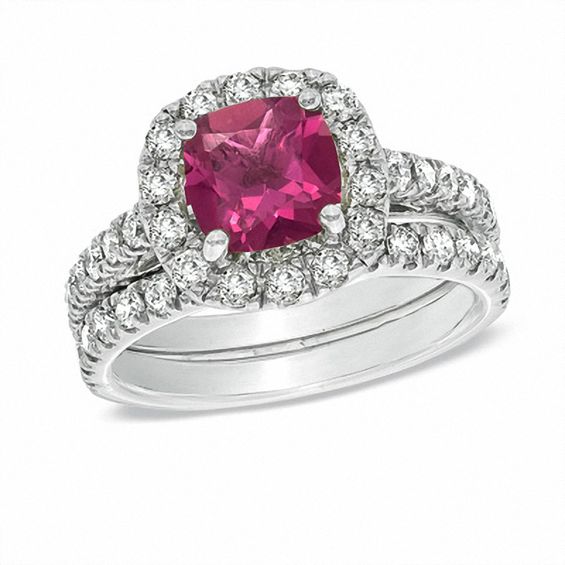 Honour the woman you love with this bright and colourful pink tourmaline and diamond bridal set. Fashioned in 14K white gold, the engagement ring showcases a 7.0mm certified cushion-cut pink tourmaline centre stone. This violet-pink gemstone is embraced in a frame of shimmering round diamonds, which also line the ring’s shank. On your wedding day, the coordinating diamond-lined wedding band completes the ensemble. Radiant with 1.45 cts. t.w. of diamonds and a bright polished shine, this bridal set is a romantic give of love. The ring includes a GSL certificate that includes the gemstone colour range, tone and intensity ratings.