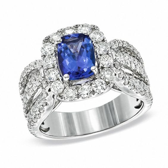 Expertly crafted in 14K white gold, this engagement ring showcases a stunning 8.0 x 6.0mm certified cushion-cut tanzanite centre stone. A frame of shimmering round diamonds wraps this violet-blue gemstone in a sparkling embrace, while additional accent diamonds grace the ring’s split shank. Radiant with 1.70 cts. t.w. of diamonds, this ring is finished with a bright polished shine. The ring includes a GSL certificate that includes the gemstone colour range, tone and intensity ratings.