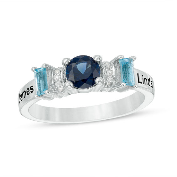 Pique her interest with this beautiful coupleâs Personalized birthstone ring. Fashioned in sterling silver, this sophisticated look features the three simulated birthstones you select – a 5.0mm round centre stone flanked by 4 x 2.0mm baguette-cut stones – separated by collars lined with shimmering diamond accents. Further customize the design with two names – each up to seven characters in length – inscribed in a print font along the shank. Buffed to a brilliant luster, this three-stone style is an accessory sheâll turn to often. Custom-made to fit her ring size. Sterling silver rings cannot be resized after purchase.