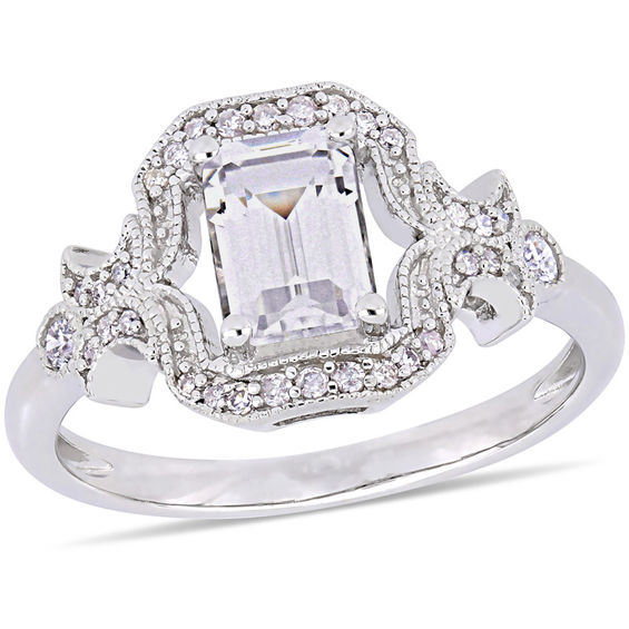 A dazzling look just for her, this refined promise ring is certain to be noticed. Crafted in sterling silver, this sophisticated design showcases a 7.0 x 5.0mm emerald-cut lab-created shimmering white sapphire wrapped in a fancy frame of sparkling diamonds and intricate milgrain borders. A sculpted scrolling motif adorned with petite diamonds and milgrain detailing flanks the centre design while bezel-set diamonds in milgrain-lined frames complete this ornate style. Radiant with 0.16 ct. t.w. of diamonds and a bright polished shine, this promise ring is a gorgeous reminder of your affection. Custom-made to fit her ring size. Sterling silver rings cannot be resized after purchase.