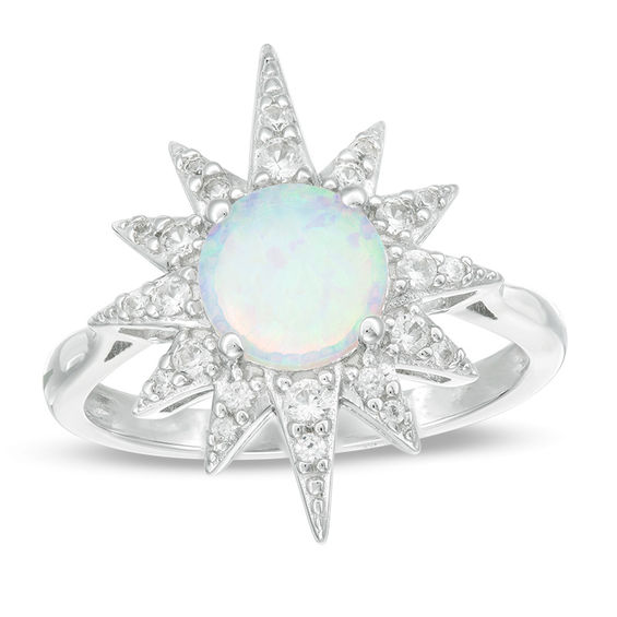 Sheâll adore the stunning design of this fanciful star ring. Crafted in sterling silver, this inspiring style features a 7.0mm lab-created iridescent opal cabochon at the centre of a sculpted starburst lined with shimmering lab-created white sapphires. Buffed to a brilliant lustre, this choice pairs wells with her dressy attire. This ring is available in size 7 only. Sterling silver rings cannot be resized after purchase.