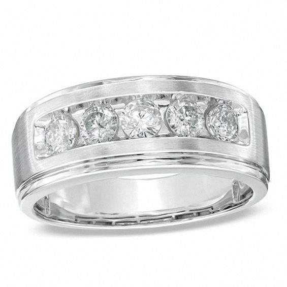 Say “I do” in sophisticated style. Fashioned in 14K white gold, this handsome band for him features five shimmering diamonds, totalling 1.00 ct., aligned across the centre. The sleek satin finish is a thoughtful touch.