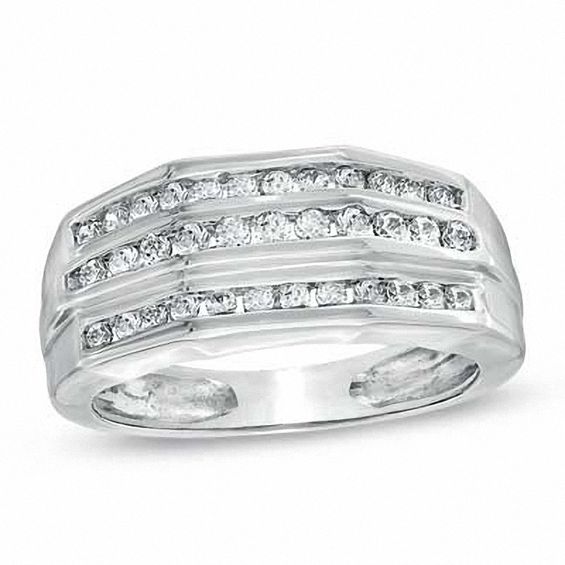 Say “I love you” to the man of your dreams with this exquisite band. Three rows of channel-set round diamonds – totalling 1.00 ct. – elegantly stretch across the top of this pristine 10K white gold band. Both bold and masculine, he’ll appreciate this shimmering, understated ring.