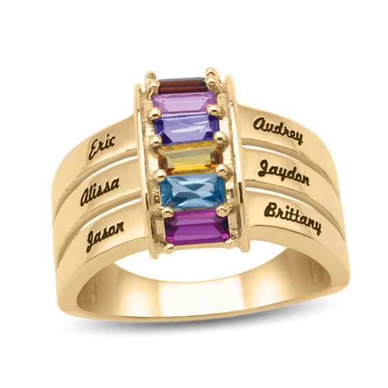 Modern and meaningful, this Personalized ring honours Mom and complements her tailored anytime look. Fashioned in your choice of silver or gold, this bold family-oriented design showcases the six 4 x 2.0mm baguette-cut birthstones you choose stacked in-between slender raised borders (a white stone will be placed where no birthstone is chosen). Lending further significance to the piece are the six corresponding names you select – each up to eight characters in length – engraved in dainty script along the gleaming triple-row shank. Buffed to a brilliant luster, this style is as distinctive as it is thoughtful. Sterling silver rings cannot be resized after purchase.