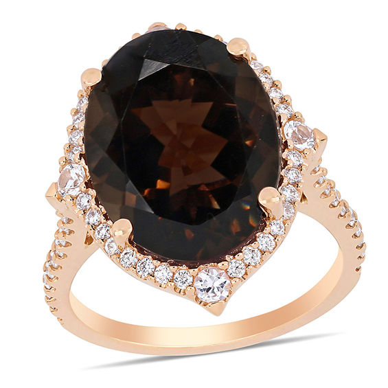 A confident accessory she’ll love to wear, this desirable gemstone and diamond ring takes her look from ready to remarkable. Fashioned in 14K rose gold, this sumptuous design showcases a decadent 16.0 x 12.0mm oval-shaped deep smoky quartz wrapped in a frame of sparkling diamonds and a quartet of 2.25mm shimmering white sapphires – one at each compass point. The shank glistens with a row of diamonds to complete this magnificent style. All diamonds boast a colour rank of H and clarity of SI2. Radiant with 0.39 ct. t.w. of diamonds and a bright polished shine, this ring packs a big visual impact.