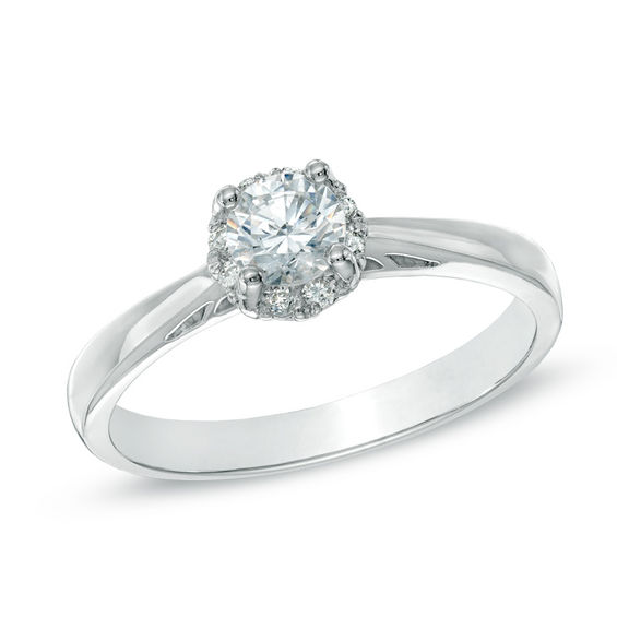 Beautifully crafted in 14K white gold, this 0.50 ct. t.w. diamond ring features a 0.39 ct. Canadian diamond centre stone, boasting a colour rank of I and clarity of I1. A halo frame of smaller round accent diamonds wraps this centre stone in a sparkling embrace. Due to the nature of pre-owned jewellery, the ring you choose may have been previously sized. Ring styles from our pre-owned jewellery inventory are sold at their current size and cannot be resized at purchase. As this inventory constantly changes, we are unable to state or guarantee the size of any pre-owned ring.