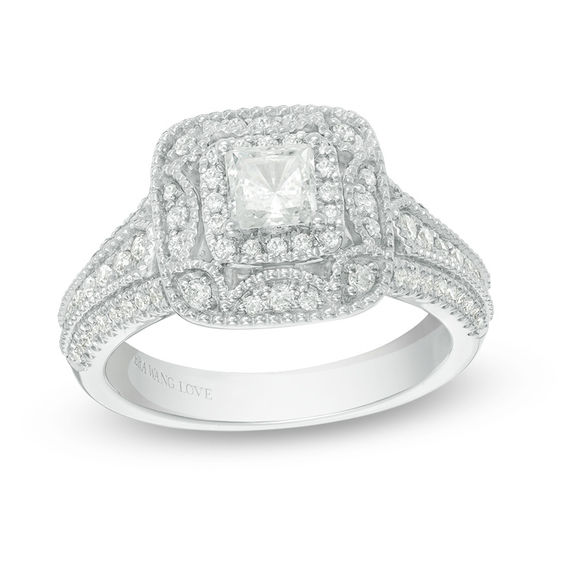 Beautifully detailed, this vintage-inspired diamond engagement ring from the Vera Wang Love Collection expresses all the romance you hold in your heart. Crafted in 14K white gold, this enticing design features a shimmering 0.45 ct. princess-cut diamond wrapped in a cushion-shaped border of diamonds. Outside, an open-worked frame of sparkling diamonds and scalloped milgrain atop a diamond and milgrained split flared shank completes this heirloom look. Two princess-cut blue sapphires, the signature of the collection and a symbol of faithfulness and everlasting love, are set into the ring’s band. Radiant with 0.95 ct. t.w. of diamonds and a brilliant buffed lustre, this comfort-fit engagement ring is certain to become a treasured keepsake. Vera Wang is exclusively ours.