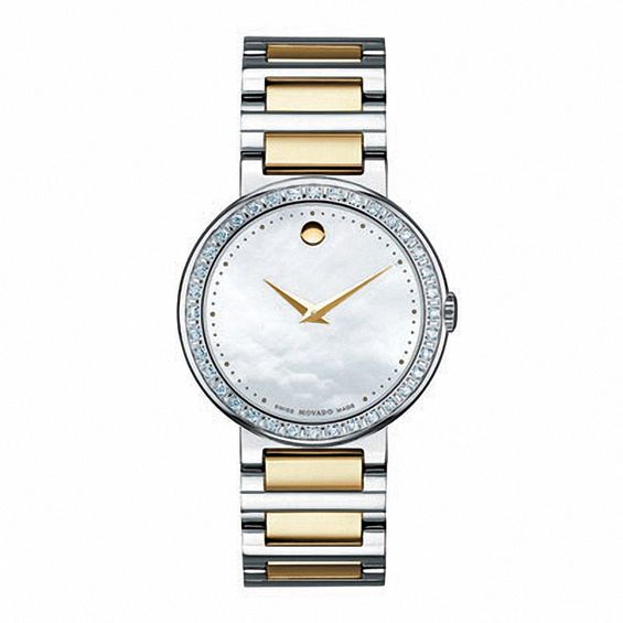 This ladies’ Movado Concerto watch features a round mother-of-pearl dial with gold-tone hands in a diamond accented bezel. Swiss quartz movement ensures accurate time keeping. This watch is water-resistant up to 30 metres and secures with a two-toned stainless steel polished link bracelet with deployment clasp. It comes with a two-year limited warranty. We are an authorized Movado dealer.