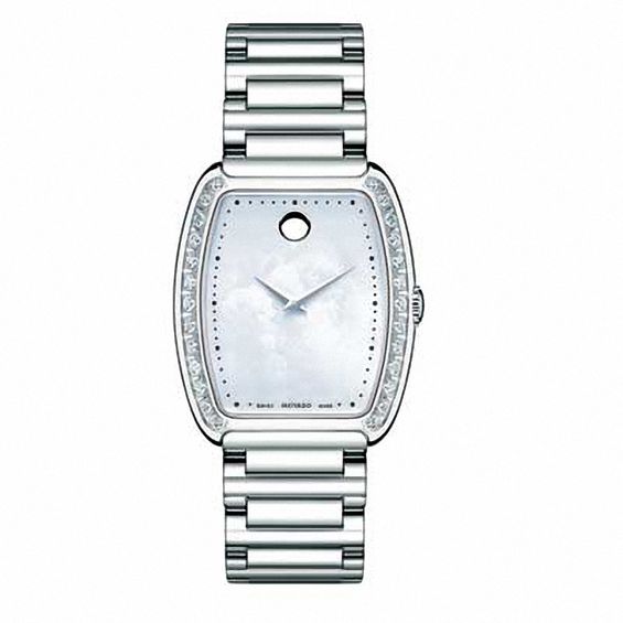 Dramatic yet polished, this ladies’ Movado Concerto watch features a white tonneau mother-of-pearl dial with silver-tone hands and a signature Movado dot at the 12 o’clock hour in a stainless steel case with a diamond accented bezel. The reliable Swiss quartz movement ensures accurate time keeping. This watch is water-resistant up to 30 metres and secures with a polished stainless steel link bracelet with deployment clasp. This watch includes a two-year limited warranty. We are an authorized Movado dealer.