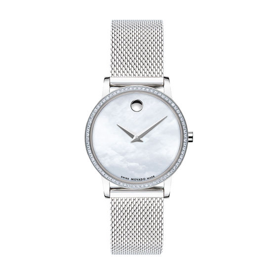 From the Movado Museum® Classic collection, this ladies’ watch features a white mother-of-pearl dial with a silver-toned signature dot 12 o’clock marker and hands, sapphire crystal, and 0.22 ct. t.w. diamond bezel in a 28.0mm stainless steel case. The reliable Swiss quartz movement ensures accurate time keeping. The stainless steel mesh bracelet secures with a push-button deployment clasp. Water-resistant to 30 metres, this watch comes with a two-year limited manufacturer warranty. We are an authorized Movado dealer.