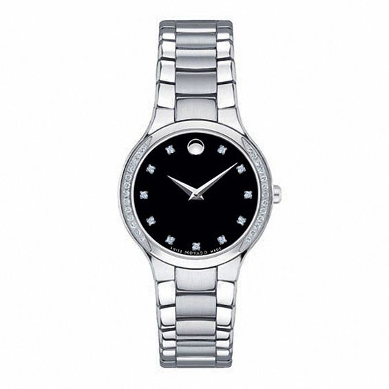 This ladies’ Movado Serio watch features a round black dial with silver-tone hands and diamond accent markers in a stainless steel case with diamond accent bezel. Swiss quartz movement ensures accurate time keeping. This watch is water-resistant up to 30 metres and secures with a polished and satin link bracelet. It comes with a two-year limited warranty. We are an authorized Movado dealer.
