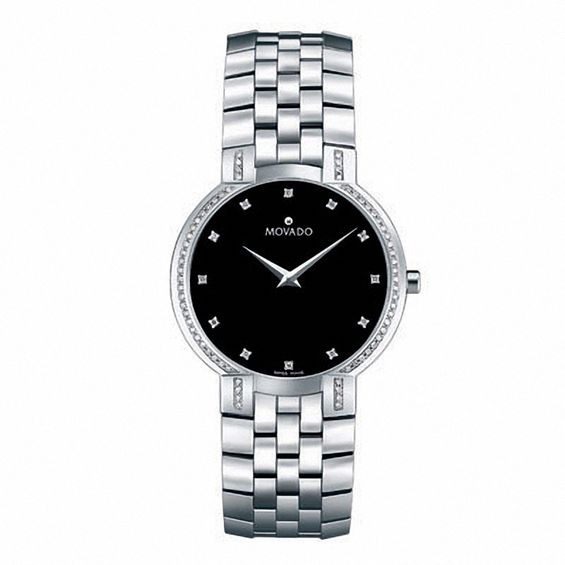 This men’s Movado Faceto watch has a round case and a black dial with diamond markers. This watch has a stainless steel bracelet and case and features a diamond bezel. It is water-resistant up to 30 metres and comes with a two-year limited warranty. We are an authorized Movado dealer.