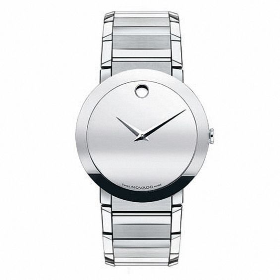 This men’s Movado Sapphire stainless steel bracelet watch has a mirrored dial in a round case. It is water-resistant and comes with a two-year limited warranty. We are an authorized Movado dealer.
