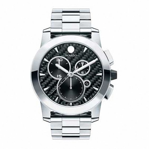An impressive, multi-functional design, this men’s Movado Vizio watch features a round black carbon fibre dial with luminous silver-tone hands and hour markers, a date display at the four o’clock hour, three chronograph sub-dials, and a signature Movado dot at the 12 o’clock hour in a stainless steel case with a tungsten carbide bezel. The reliable Swiss quartz movement ensures accurate time keeping. This watch is water-resistant up to 30 metres and secures with a polished stainless steel link bracelet with deployment clasp. This watch includes a two-year limited warranty. We are an authorized Movado dealer.
