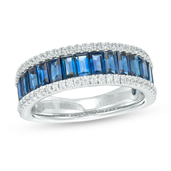 Seal your vows with the splendor of this gemstone and diamond wedding band from the Vera Wang Love Collection. Crafted in 14K white gold, this dramatic design mesmerizes with channel-set baguette-cut bright blue sapphires edged on both sides with sparkling diamonds. Set into the ring’s shank is a petite sapphire, the signature of the collection and a symbol of faithfulness and everlasting love. Radiant with 0.23 ct. of diamonds and a brilliant buffed lustre, this comfort-fit wedding band is a forever delight. Vera Wang is exclusively ours.